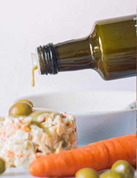 CÓMO USARLA Es un producto listo para emplear sin preparación previa. Muy recomendable como aliño para pastas, ensaladas y arroces, encurtidos (anchoas, boquerones), conservas de pescado y mariscos al natural, como ingrediente en ensaladillas, para dipear con patatas fritas, pescados y mariscos asados, como base para salsas, y todo tipo de carpaccios, tártares y ceviches (de carne y de pescado).