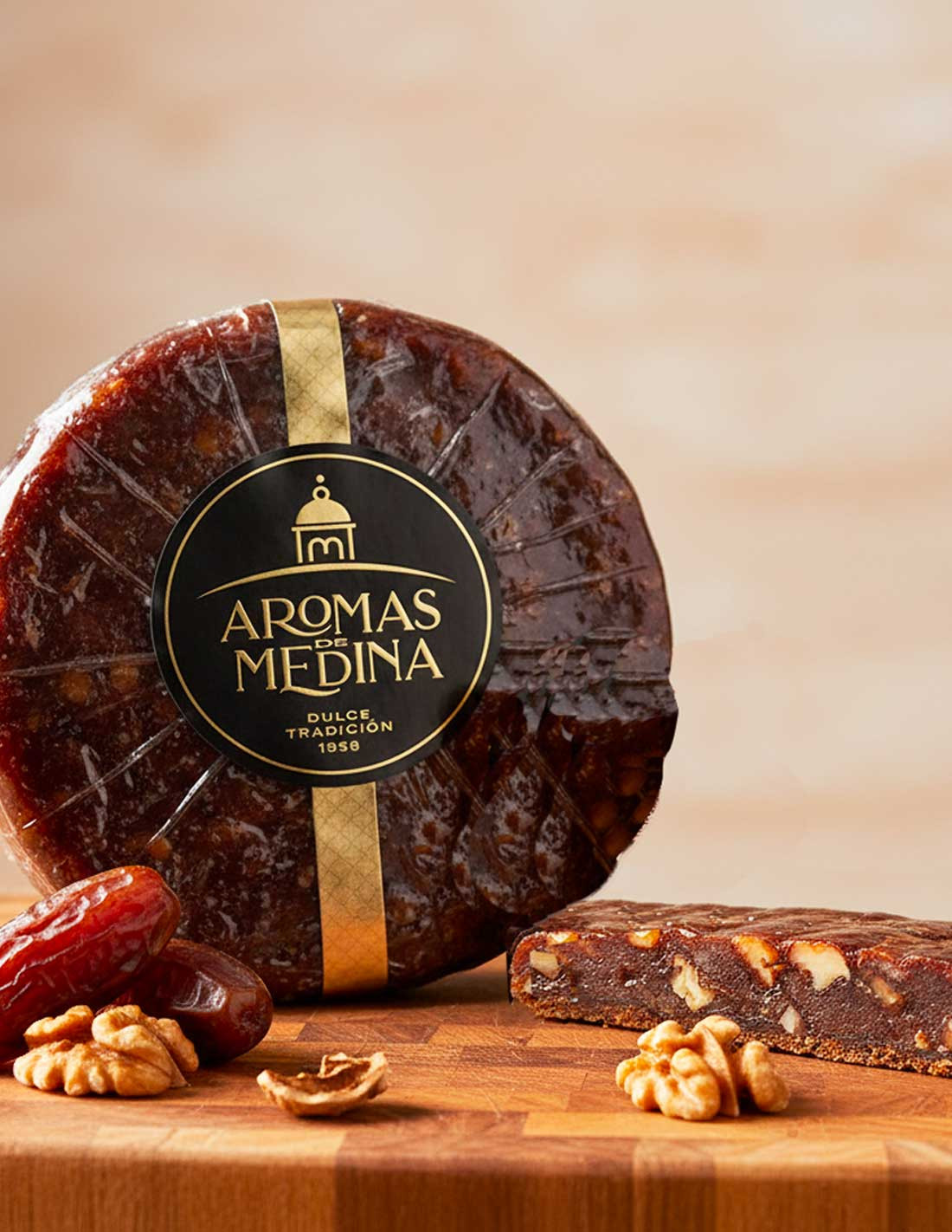 Aromas de Medina elabora su Pan de Dátil con Nueces con la mejor selección de dátiles y nueces de California, combinando sabor, energía y tradición en un producto natural y saludable. Su textura densa y su dulzor natural lo convierten en un auténtico manjar, ideal para disfrutar solo o acompañado de quesos, yogur o una copa de vino. Una delicia artesanal capaz de conquistar a los paladares más exigentes.