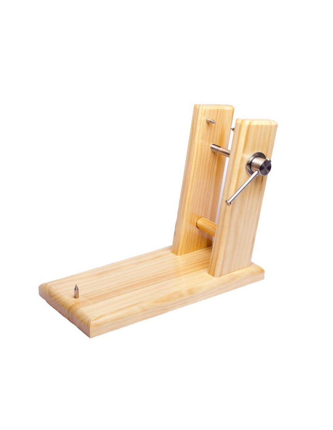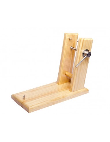 La particularidad de este jamonero es el tipo de sujeción de la pezuña, que funciona gracias al torno, que al girar ejerce presión sobre el jamón.