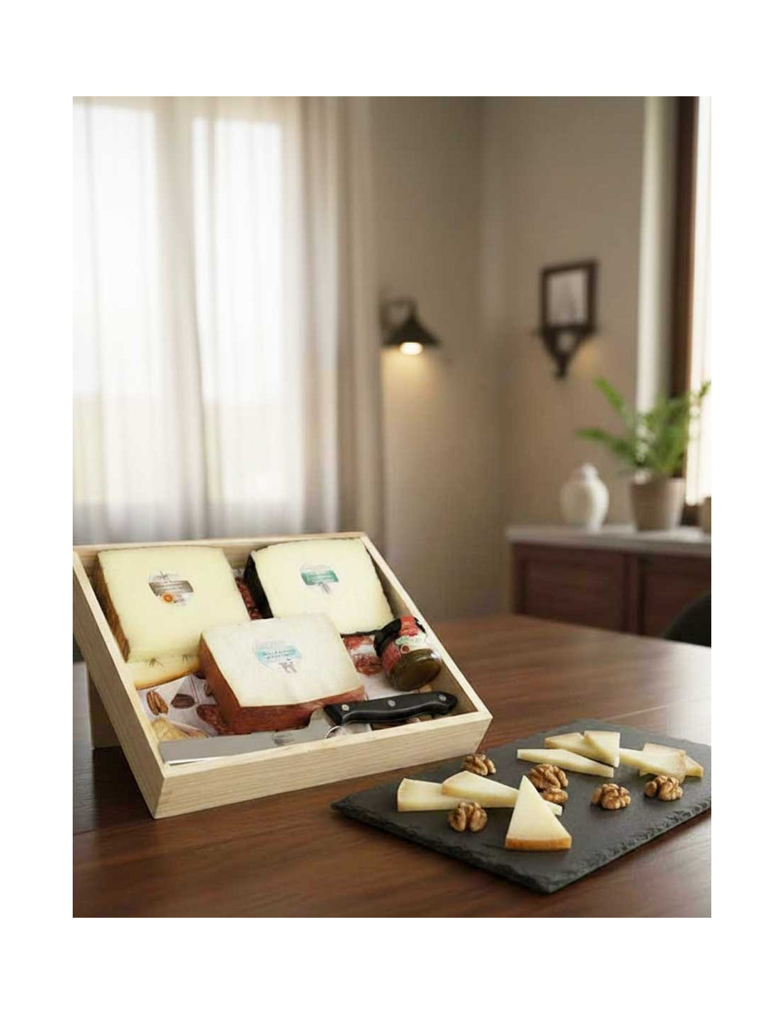 Una deliciosa opción para disfrutar de las variedades de nuestros quesos, una bandeja de selección compuesta por tres quesos de 150g., cuchillo de queso y mermelada de higo.