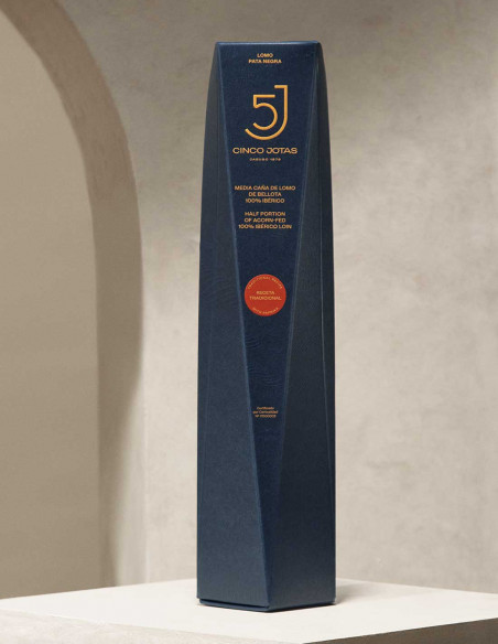 Cinco Jotas Acorn-fed 100% Ibérico Loin is a cold meat cured and handcrafted in Jabugo. It’s derived from an entire piece of meat located in the lower back of the animal. Its known to have a powerful and fragrant aroma, a faint maroon and ash colour with a defined sheen, and a lightly peppery and smoky flavour.