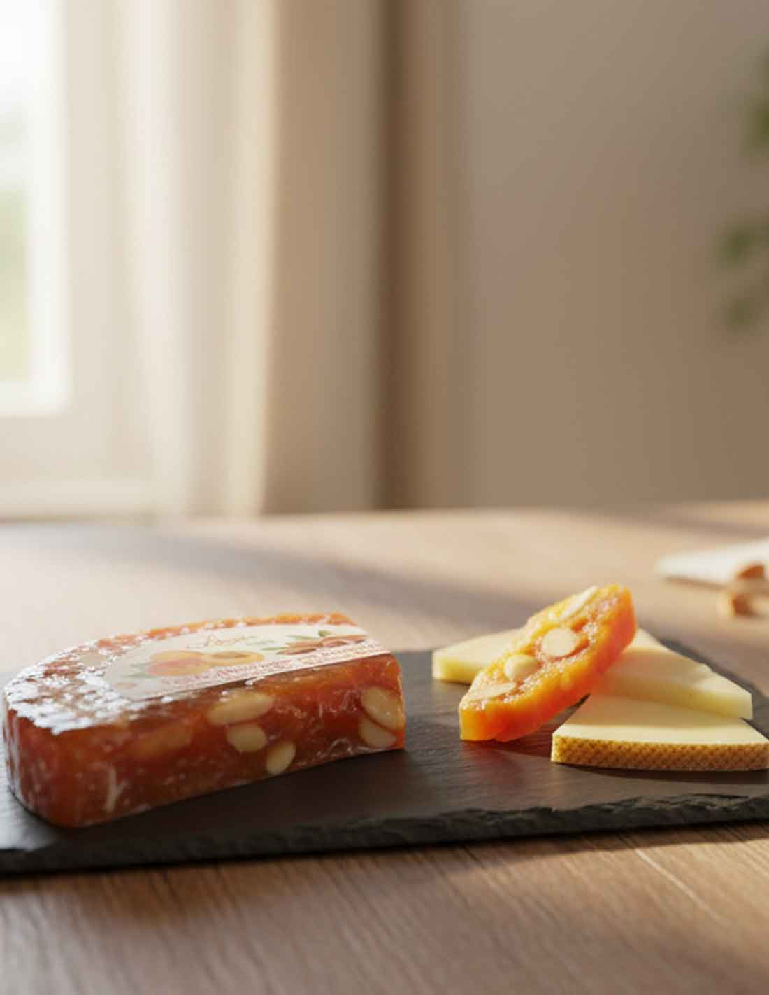 Its flavor is very special when diced or sliced and paired with cow’s milk or sheep’s milk cheese, as the acidity and aroma of the apricot and almond combine beautifully with the flavors of the cheeses.